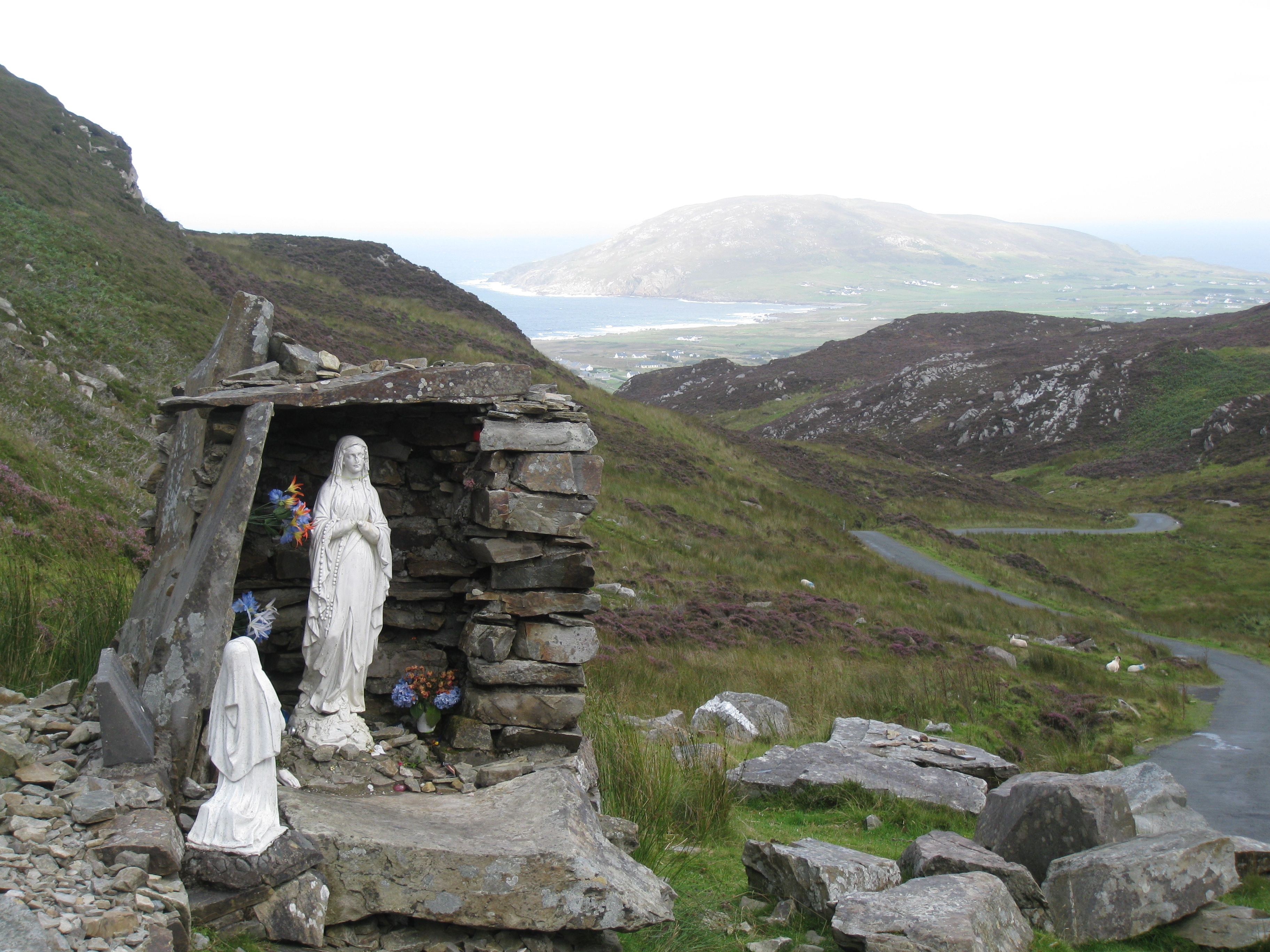 The centre of Mamore gap, looking down into Urris. The shrine is part of a larger structure that marks the location of St Eigne's Well, one of the famous Holy Wells of Ireland.
