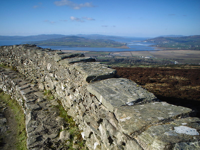 Of course, all of this is just myths. Modern archaeologists date the original ringfort on the site back to the Iron Age, and so to 500 BC at the earliest – which means, of course, that it does still predate Ptolemy’s map. In 674 the High King of Ireland, Finsnechta the Festive (of the southern Ui Neill), destroyed the fort. A hundred years later his relatives the northern Ui Neill moved into the site and built themselves a fort there, from which they ruled the kingdom of AiIeach for the next five hundred years. It was burnt by Viking raiders in the tenth century, but rebuilt. Finally, in 1101 the King of Munster, in revenge for the destruction of one of his castles, invaded and demolished the place. He had his men each carry one of the stones from the castle away, so that it could not be rebuilt. It remained the symbolic capital of Aileach until the title of the kingdom fell into disuse in the 13th century, being replaced by the Kingdom of Tir Eoghain (the forerunner of modern Tyrone).