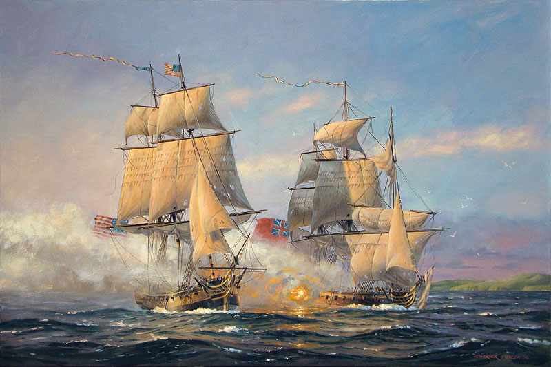 John Paul Jones' ship, the Ranger, in combat with HMS Drake off the coast by Carrickfergus. Painting by Patrick O'Brien